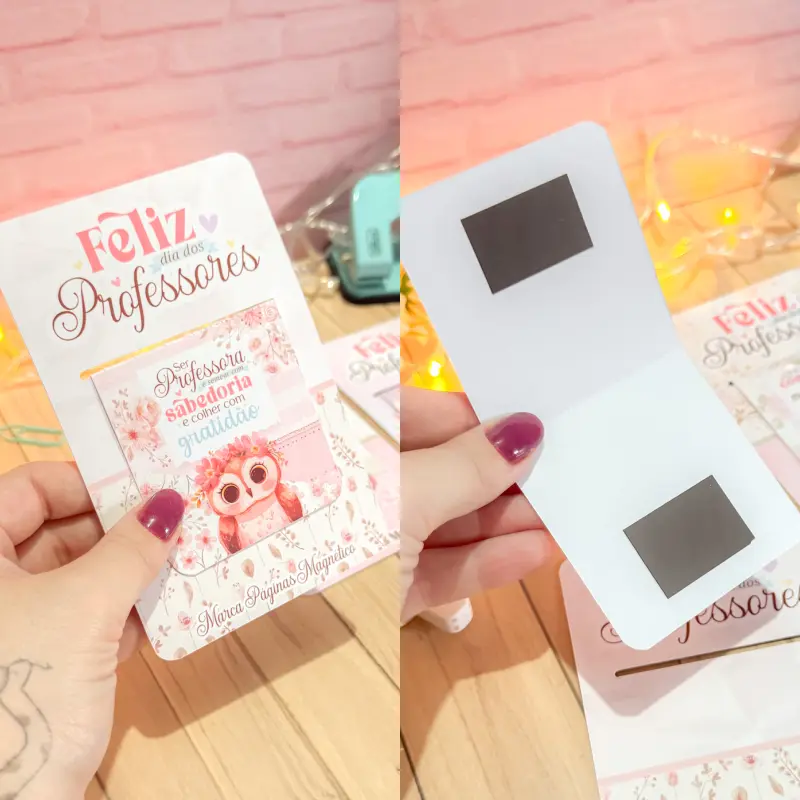 Marca-páginas magnéticos com design exclusivo para professores, perfeitos para organizar livros e materiais didáticos. Ideal para presentear educadores ou para uso pessoal.