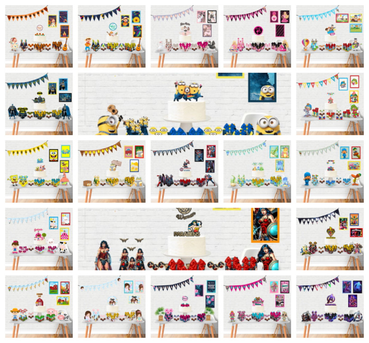 – 21 TEMAS : Arraía Menina, Arraía Menino, Bailarina, Barbie, Batman, Bob Esponja, Boteco, Capitão America, Dinossauro Baby, Fazendinha Menina, Fazendinha Menino, Festa do Pija, Minions, Vingadores, Mulher Maravilha, Power Rangers, Flora, Lol, Mundo Bita, Patati e Patatá, Pocoyo.